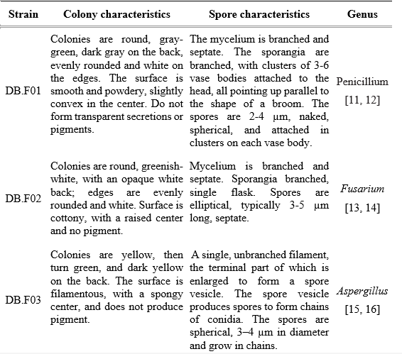 From the results of observing both the characteristics of the colonies and the sporophytes of the isolated strains, it is possible to classify the fungal strains into the genus. Based on the published results of the study on the biological morphology of molds, five mold strains were identified as belonging to 4 different genera: Penicillium, Aspergillus, Fusarium, and Nigrospora. The morphological characteristics of the 5 fungal strains were described in Table 1.