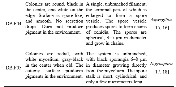 Based on the results of ITS region sequencing, the nucleotide sequence of the filamentous fungal strain DB.F05 has 100% similarity to the filamentous fungal strain Nigrospora lacticolonia CGMCC 3.18123 (NR_153471). Combining the characteristics of colony morphology, spore stalk and the results of self-amplification of the ITS gene region, DB.F05 was identified as Nigrospora lacticolonia DB.F05. This sequence was submitted to GenBank under accession number PV942108.