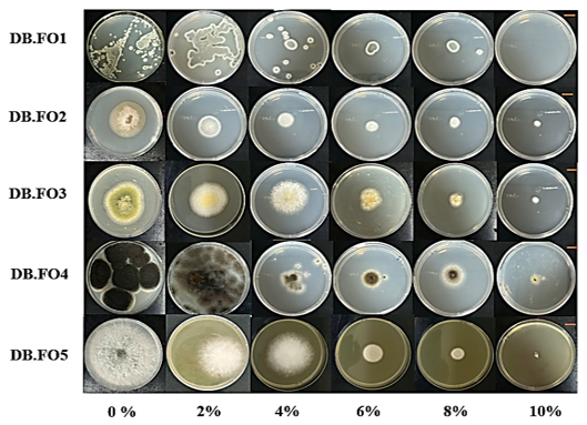 The fungal strains were cultured on PDA medium supplemented with antibiotics (100 mg/L ampicillin; 100 mg/L tetracycline) at a temperature of 30°C for 7 days across various salt concentrations (0, 2, 4, 6, 8, 10%). Similarly, growth potential was determined based on the colony diameter of each fungal strain [2].
