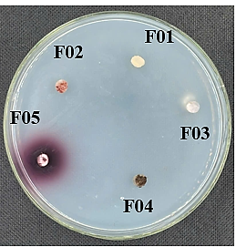 Five fungal strains were evaluated for their ability to produce extracellular enzymes by measuring the diameter of the guaiacol degradation ring, which indicates laccase production. As shown in Figure 6, only one strain, DB.F05, exhibited laccase activity, with an enzyme ring diameter of approximately 6 ± 0.5 mm.