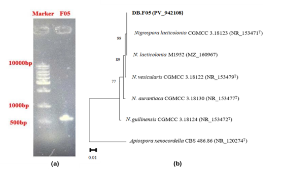 Figure 7. (a) Electrophoresis result of the amplification product using ITS primers in 1% agarose, Marker: 500-10000bp (b) Phylogenetic tree showing the relationship between strain DB.F05 and reference strains in the NCBI database.