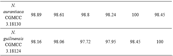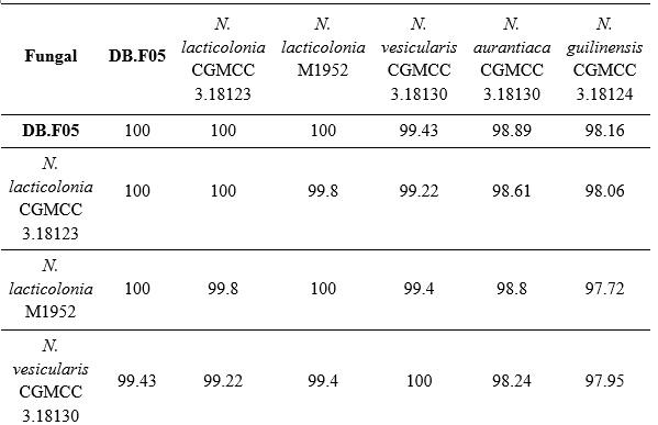Table 3. Matrix showing the similarity of strain Nigrospora lacticolonia DB.F05 with reference strains in the NCBI database