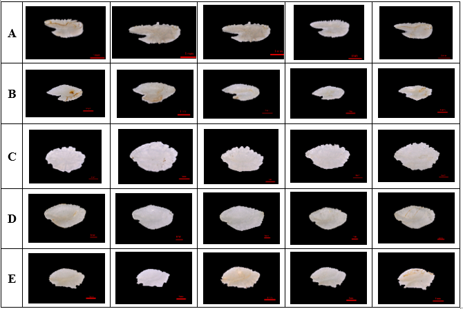 Figure 2. Representative otolith samples of the five species: (A) Selaroides leptolepis; (B) Sardinella gibbosa; (C) Gerres filamentosus; (D) Lutjanus russellii; (E) Selar crumenophthalmus.