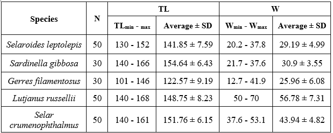 Table 2. Sample size and morphometric data for five fish species from the Lang Co - Hai Van coastal area