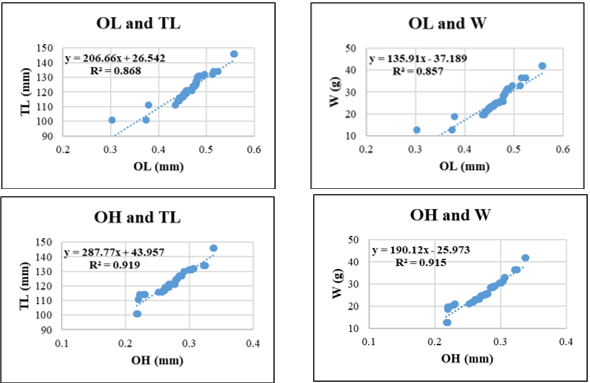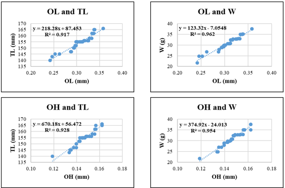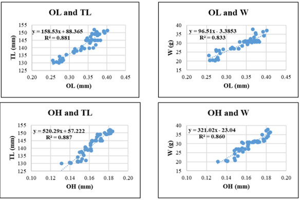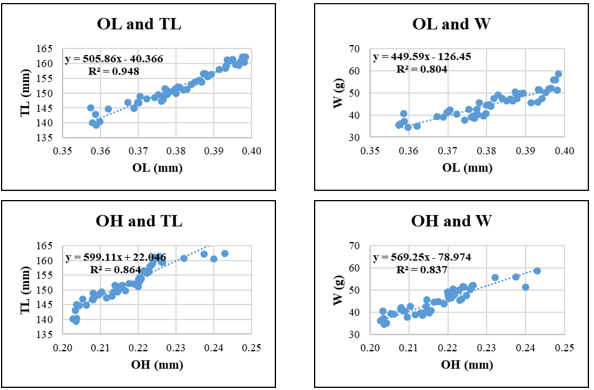In Sardinella gibbosa, the strongest relationship was found between OL–W (R² = 0.962), followed by OP and W (R² = 0.957) and OH-W (R² = 0.954), highlighting the potential of vertical otolith development and edge morphology as indicators of somatic growth. The relationships involving OH and TL or OA and W showed slightly lower, yet still robust R² values (0.928 and 0.930, respectively).