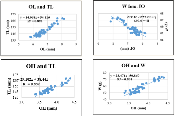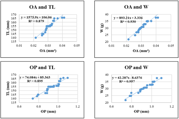 The following morphometric relationships were analyzed: OL - TL; OH - TL; OL - W and OH - W; OP - TL; OA - TL; OP - W and OA - W. All morphometric relationships were modeled using simple linear regression, selected based on the best fit to the data distribution. The general form of the linear regression model used is: y = a + bx, where x is the independent variable and y is the dependent variable derived from empirical data. Coefficients a and b were determined from actual measurements and used to estimate theoretical values of y for given values of x. The significance of the regression was tested using analysis of variance (ANOVA).
