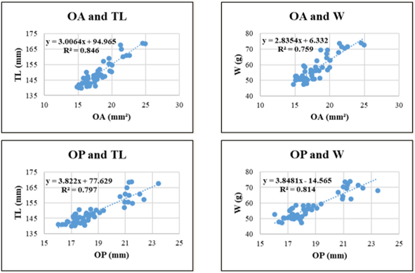 Selar crumenophthalmus displayed high R² values for relationships involving OA–TL (0.933) and OP–TL (0.925), indicating strong predictive potential of otolith surface and perimeter features for body length. Conversely, W-related regressions such as OA-W (R² = 0.795) and OP-W (R² = 0.791) were less predictive, possibly due to individual variation in weight relative to otolith structure.