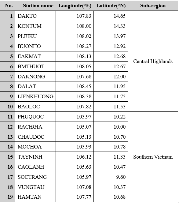 This study used the observed dataset over the 39-year period from 1981 to 2019 to examine the climatology, trends on the RSOD and RSCD over the Central Highlands and Southern Vietnam. Daily rainfall data were obtained from 19 meteorological stations gauges managed by the Vietnam Meteorological and Hydrological Administration (Table 1). To minimize the potential bias from missing data, monthly (annual) means were computed only when a station had data available for at least 25 days in a month (330 days in a year).