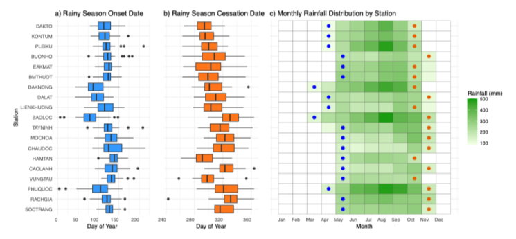 Rainfall-based criteria was used to detect rainy season onset (RSOD) and cessation (RSCD) from 1981 to 2019 across Central Highlands and Southern Vietnam.