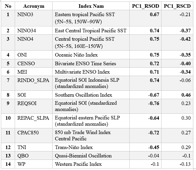 Table 3. Correlation between climate indices and EOF1 of RSOD and RSCD. Positive and statistically significant values at the 95% confidence level of the t-test are highlighted in bold, and negative and statistically significant values at the 95% confidence level of the t-test are highlighted with bold and italic