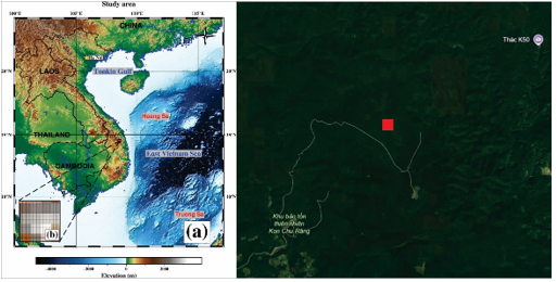 The study was conducted from July to September 2024 in Kon Ch Rang Nature Reserve, northeastern Gia Lai Province. Situated at the transition between the northern and southern Annamite Mountains, the Reserve harbors diverse tropical forests and provides critical habitat for rare and endemic species. Vegetation types include evergreen broadleaf forest, mixed broadleaf - coniferous forest, and grassland - shrubland. For this study, a standard 1-hectare plot (100 × 100 m) was established in a mixed forest within the legally protected core zone (Figure 1).