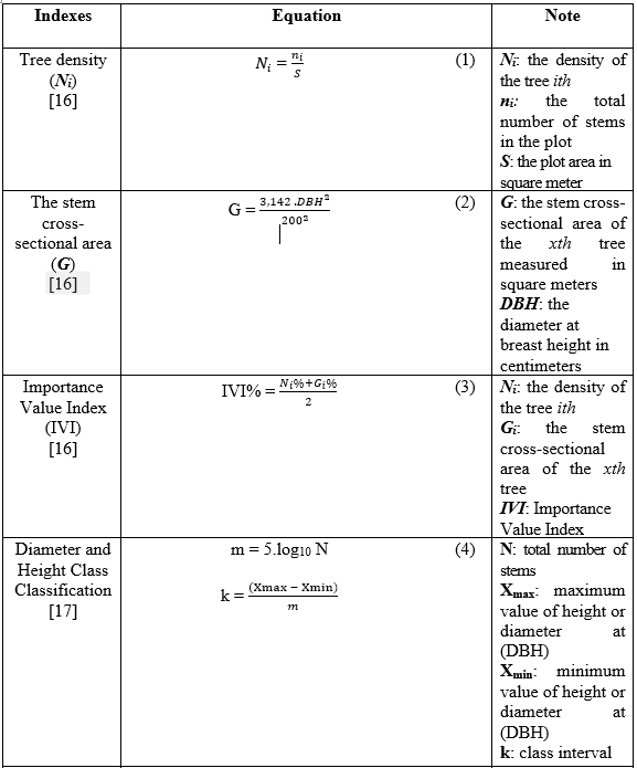 Diameter and Height Class Classification: DBH and Hvn were grouped into size classes to facilitate structural analyses. The DBH data were classified into 4-cm intervals (e.g., 0 - 4, 4 - 8, 8 - 12 cm, etc.), while tree height was divided into 2 - 5 m intervals depending on tree size. These class widths are commonly used in traditional tropical forest structure studies in Vietnam and are theoretically derived from a modified version of Sturges’ rule, which determines the optimal number of classes in a frequency histogram. Following the recommendations of Valente and Sánchez-Rodríguez (2019) - who applied similar class-interval methods in tropical forest analyses - we adopted this modified approach to ensure both sufficient resolution and adequate sample representation per class [17].