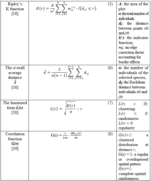 One of the most widely used tools for describing and quantifying the spatial distribution of individuals is Ripley's K-function. This model allows for assessing whether points (e.g., individual trees) are randomly distributed, clustered, or uniformly distributed in two-dimensional space. Many studies in tropical and temperate forests have successfully used Ripley's K function to analyze the distribution of woody species in both the canopy and understory [6]. Furthermore, the model has been extended to analyze spatial relationships among different species. Several studies have shown that analyzing spatial interactions between species can shed light on competitive or facilitative phenomena [7]. Based on these research findings, Ripley's K function is commonly used in forestry to help determine optimal planting densities to reduce competition and in forest conservation management to guide the design of restoration plans based on natural spatial structures.