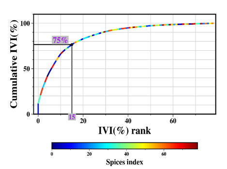 Selecting species for spatial pattern analysis: When species are ranked in descending order of their IVI%, the point at which the cumulative IVI% reaches 75% signifies that the collective importance of these species constitutes three-quarters of the total community's importance. These species are considered dominant contributors to the community's overall structure and composition and are therefore selected for detailed spatial pattern analysis.