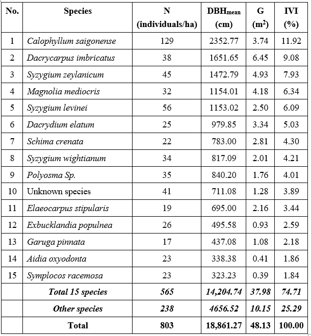 Dominance is a measure of the relative importance of species within the forest. After the evaluation by their IVI%, it revealed a high level of domination by six tree species (i.e. Calophyllum saigonense, Dacrycarpus imbricatus, Syzygium zeylanicum, Magnolia mediocris, Syzygium levinei and Dacrydium elatum) were determined as dominant trees species (Table 2). The high IVI of a species is not only indicated its dominance and ecological success but also its good power of regeneration. Among those dominating woody species, Calophyllum saigonense was the most ecologically important woody species (IVI=11.92%), followed by Dacrycarpus imbricatus (IVI=9.08%) and Syzygium zeylanicum (IVI=7.93%). The results of the sample plot data analysis are presented in detail in Appendix III.