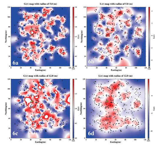 Analysis of the spatial distribution maps in 6a - b and 6c - d reveals that at a search radius of 5 m, the values of G(r) > 1 and L(r) >0 indicate a high degree of local clustering among individuals. The presence of hot-colored regions in the maps reflects the fragmentation of the population into distinct clusters, suggesting strong small-scale aggregation. These clusters are primarily localized, highlighting the fine-scale heterogeneity in the spatial arrangement of dominant tree individuals. For instance, Figure 6b illustrates a pronounced concentration of clusters in the central region of the plot, as evidenced by elevated L(r) values.