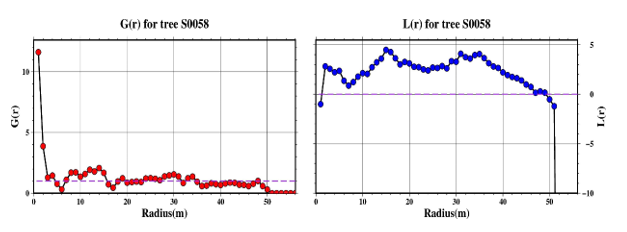 Figure 7 presents an example of the pair correlation function G(r) and the linearized Ripley’s K-function L(r) plotted against search radius for tree individual Dacrycarpus imbricatus - S0058, which is located in a region of pronounced clustering. The two curves illustrate how the values of functions change with increasing radius, providing the scale-dependent nature of spatial aggregation around this tree. Notably, both functions exhibit values greater than the expected threshold under complete spatial randomness, particularly in the range from 5 m to 15 m for G(r) line, indicating significant local clustering. The purple horizontal lines in the graph represent the theoretical thresholds distinguishing between clustered (above the line) and fragmented or dispersed (below the line) spatial patterns. The simultaneous elevation of both functions above these thresholds confirms that Dacrycarpus imbricatus is situated within a high-density cluster, and the trend curves reveal the spatial scales at which this aggregation is most pronounced.