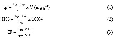 C₀ and Cₑ (mg L⁻¹) represents the initial and equilibrium concentrations of Auramine O, respectively, V (L) is the volume of the adsorption solution, and m (g) is the mass of the polymer. qₘ MIP and qₘ NIP (mg g⁻¹) refer to the maximum adsorption capacities of MIPs and NIP, respectively.