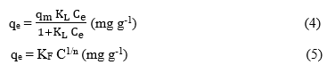 Here, qₑ and qₘ represent the equilibrium adsorption capacity and the maximum adsorption capacity (mg g⁻¹), respectively. The Langmuir constant KL (L mg⁻¹) and the Freundlich constant KF (mg g⁻¹) are both indicators of adsorption strength [26, 27]. In the Freundlich isotherm model, the parameter n reflects the degree of surface heterogeneity and offers insights into the distribution of adsorbed molecules on the absorbent surface. This model describes multilayer adsorption on heterogeneous surfaces and is particularly useful for describing non-ideal adsorption systems.
