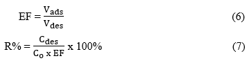 To evaluate the material’s long-term reusability, five consecutive adsorption–desorption cycles were conducted. The desorption yield was quantified using the enrichment factor (EF) and the desorption percentage (R%), calculated based on the following formulas: