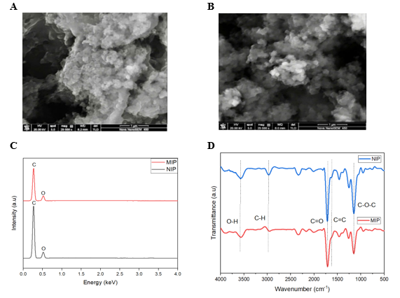 Figure 1. (A) SEM image of NIPs; (B) SEM image of MIPs; (C) EDS data and (D) FT-IR spectrum of NIPs and MIPs