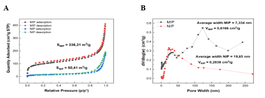 Figure 2. (A) Nitrogen adsorption–desorption isotherm plots of MIPs and NIPs at 77 K; (B) Pore size distribution data of MIPs and NIPs.