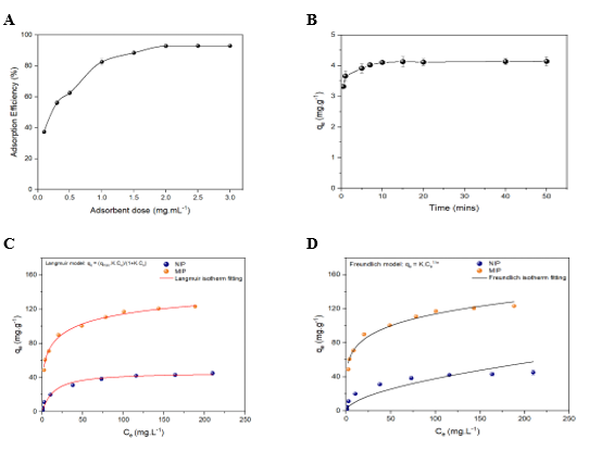 Figure 3. (A) Study of optimized adsorbent concentration; (B) Adsorption duration study; (C) Langmuir isotherm adsorption model and (D) Freundlich isotherm adsorption model of MIPs and NIPs with Auramine O as template (n = 3).