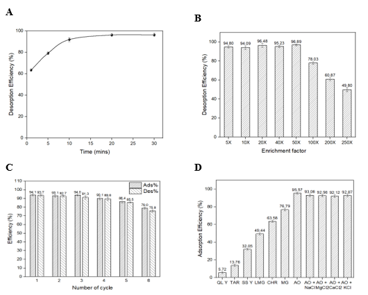 An investigation was conducted to optimize the desorption duration using the solvent system of ethanol:acetic acid (8:2 v/v) in the range of 0 - 30 minutes (Figure 4A). It can be observed that desorption efficiency gradually increases during the first 20 minutes and reaches the highest value of 96.08%. Hence, a duration of 20 minutes was chosen as the optimized desorption time for further experiments. Enrichment factor (EF) study with initial Auramine O concentration of 0.05 ppm is shown in Figure 4B. Across the EFs of 5–50 times, the MIPs material obtained recoveries range from 92.08% to 96.31%, indicating sufficient enrichment capability. However, the recovery began to drop significantly when the enrichment factor exceeded 50 times due to the higher accumulation of Auramine O in the polymer network.
