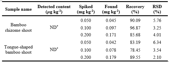 Table 3. The Auramine O detection results in bamboo shoot samples (n = 3).